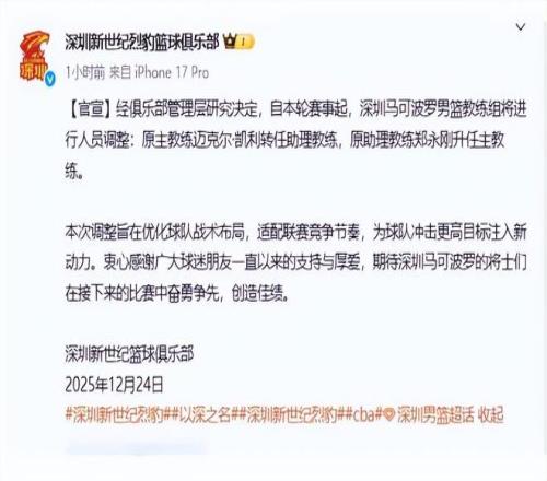 消息內容是:“經俱樂部管理層研究決定,自本輪賽事起,深圳馬可波羅男籃教練組將進行人員調整:原主教練邁克爾-凱利轉任助理教練,原助理教練鄭永剛升任主教練?!?/p>