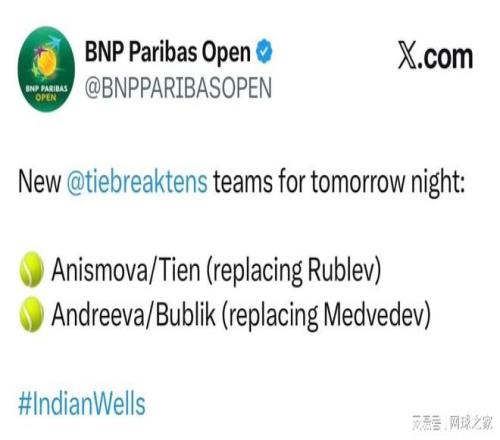 就在外界一直在等待梅德韋杰夫和盧布列夫是否已經(jīng)順利離開迪拜的最新消息時,印第安維爾斯官方的另一則新消息卻提前來了,直接官宣取消了這對哥倆的混雙搶十表演賽資格,由勒納錢和布勃利克替代。