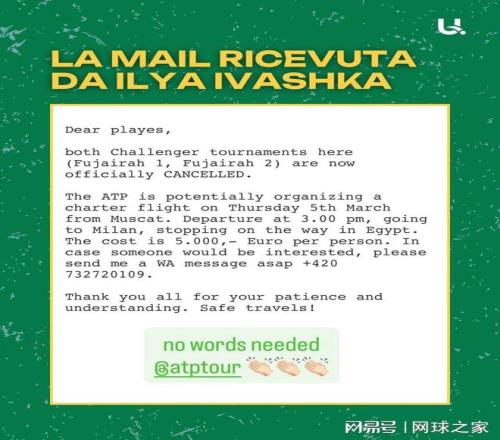 很快媒體報(bào)道,ATP為了準(zhǔn)備讓被困的球員和相關(guān)隨行人員離開阿聯(lián)酋,準(zhǔn)備包機(jī)從“從馬斯喀特起飛,經(jīng)停埃及后前往米蘭”,帶離所有人安全離開中東。