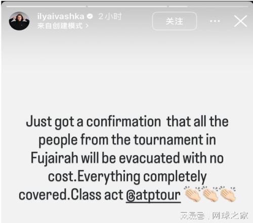 “剛收到確認(rèn),所有在富吉拉賽事的人員都將被免費(fèi)撤離,所有費(fèi)用由ATP完全承擔(dān),這波操作太贊了?!?伊利亞·伊瓦什卡在說(shuō)這番話(huà)的時(shí)候非常開(kāi)心,還刻意對(duì)ATP這么做送上了掌聲。