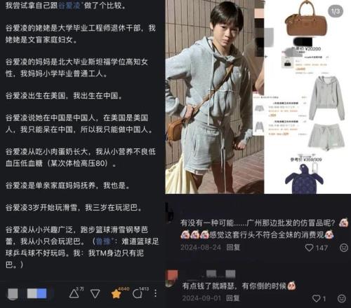 (圖1:網(wǎng)友對(duì)比自己與谷愛(ài)凌;圖2:全紅嬋買包爭(zhēng)議)