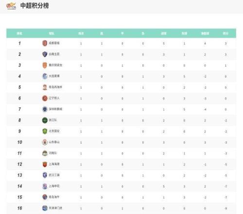 2026中超第1輪戰(zhàn)況+積分榜:蓉城領(lǐng)跑海港爆冷