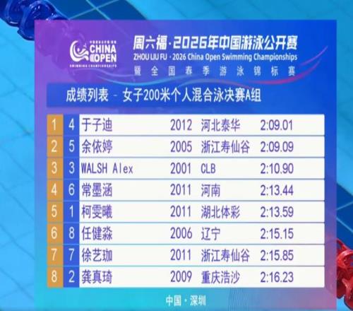 中國游泳公開賽迎來最后一個比賽日,13歲的中國游泳新星于子迪再次閃耀全場,在女子200米個人混合泳決賽,于子迪在最后一個50米幾乎落后一個身位的情況下,上演了瘋狂逆襲,最終以2分09秒01奪冠,幾乎全程領先的余依婷在最后時刻被逆轉(zhuǎn),2分09秒09獲得亞軍,亞歷克斯·沃爾什2分10秒90獲得季軍。