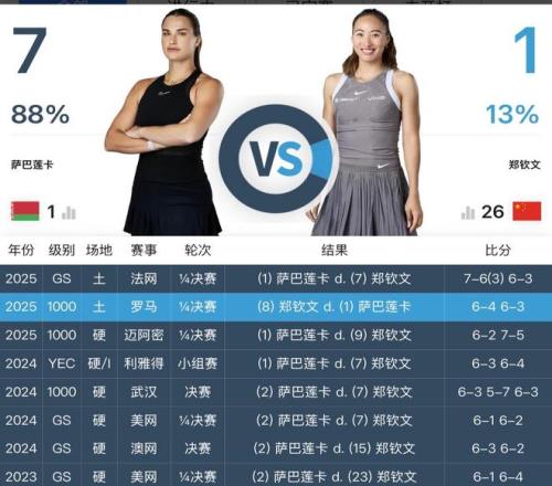 鄭欽文唯一擊敗薩巴倫卡的比賽是在2025年的羅馬站1/4決賽,她以6-4/6-3獲勝。這次,鄭欽文能否翻越世界第一這座大山?