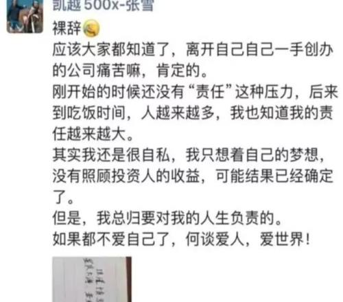 2024年3月的時候,張雪忽然對外宣布,自己已經(jīng)辭職離開了凱越,他說,離開自己一手做起來的公司,這個決定肯定是很痛苦的,不過因為他和投資人因理念問題產(chǎn)生了分歧,所以離開。