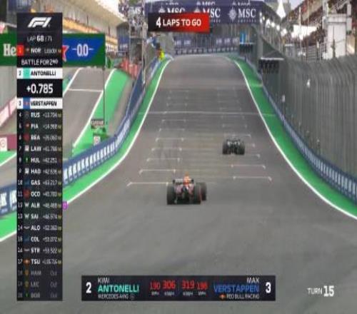 第六十八圈:維斯塔潘已經(jīng)距離P2的安東內(nèi)利不足一秒
