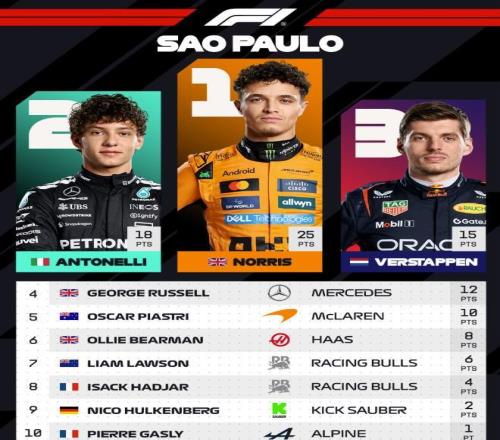 北京時(shí)間11月10日,F(xiàn)1巴西大獎(jiǎng)賽正賽正式結(jié)束。諾里斯桿位奪冠,安東內(nèi)利第2,維斯塔潘維修區(qū)起步拿到第3,拉塞爾第4,皮亞斯特里第5,貝爾曼第6,勞森第7,哈賈爾第8,霍肯伯格第9,加斯利第10。