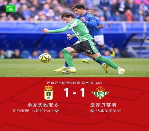 北京時(shí)間1月10日西班牙足球甲級(jí)聯(lián)賽 聯(lián)賽 第19輪,皇家奧維耶多主場(chǎng)對(duì)陣皇家貝蒂斯。下半場(chǎng)沙伊拉禁區(qū)外貼地?cái)?,之后安東尼傳中,洛塞爾索頭球破門。最終比分皇家奧維耶多1-1皇家貝蒂斯。