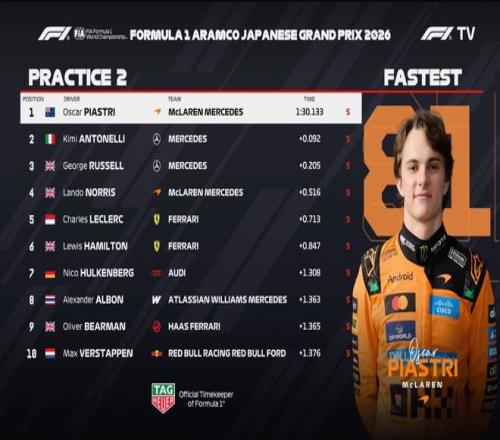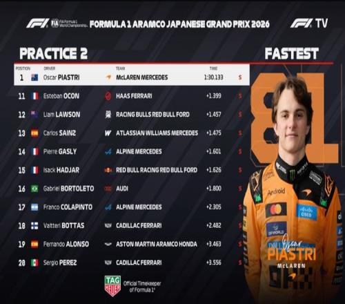2026F1日本大獎賽今天下午結(jié)束了第二次練習(xí)賽,麥克拉倫開始發(fā)力,皮亞斯特里以1分30秒133位列第一,梅奔兩位車手安東內(nèi)利和拉塞爾排在P2和P3,諾里斯P4,法拉利雙雄排名與一練沒有區(qū)別,依舊樂扣第五,老漢第六。