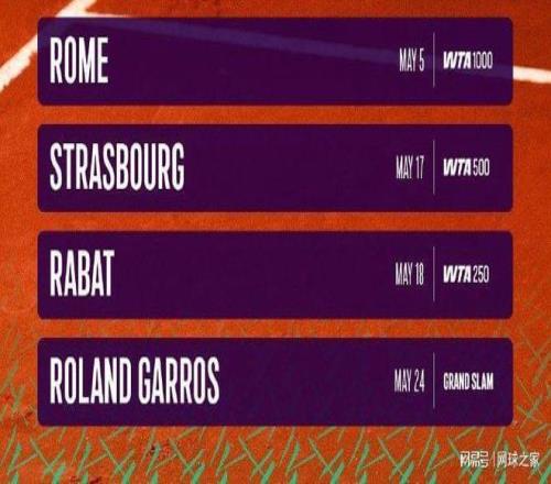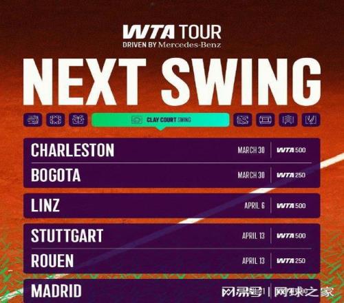 我們再來關(guān)注其它消息。北京時(shí)間昨晚,WTA官宣了今年紅土賽季的賽歷。這份賽歷從3月底開始,一直到6月上旬,其中包括三站250賽、四站500賽和兩站1000賽,最后是大滿貫賽的法網(wǎng)。具體賽事安排,附圖里有詳細(xì)內(nèi)容,球友可點(diǎn)擊放大觀看。