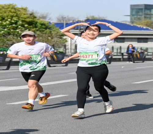3月28日,上海蘇州河半程馬拉松,選手在比賽中比心。澎湃新聞?dòng)浾?朱偉輝 圖