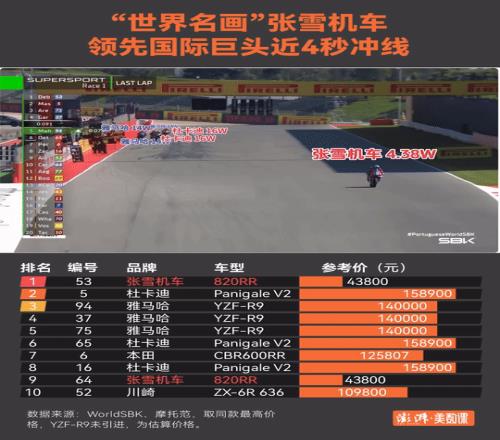在第一回合較量中,駕駛張雪機車的53號法國車手瓦倫丁·德比斯,領(lǐng)先近4秒沖線,碾壓一眾大牌。