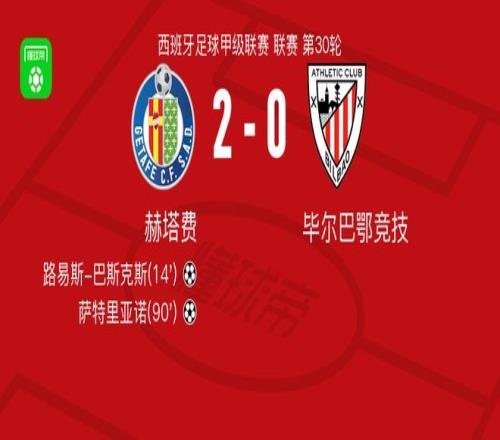 北京時間4月5日西班牙足球甲級聯(lián)賽 聯(lián)賽 第30輪,赫塔費主場對陣畢爾巴鄂競技。赫塔費路易斯-巴斯克斯破門,薩特里亞諾破門。最終比分赫塔費 2-0 畢爾巴鄂競技。