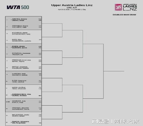 我們?cè)賮黻P(guān)注WTA500林茨站。北京時(shí)間昨晚,本站賽事的雙打簽表出爐,中國(guó)老將張帥與羅馬尼亞人科斯蒂亞搭檔出戰(zhàn),首輪對(duì)陣美國(guó)組合斯蒂芬斯/沃利內(nèi)茨。湯千慧、楊釗煊 梁恩碩等中國(guó)球員也將參賽。
