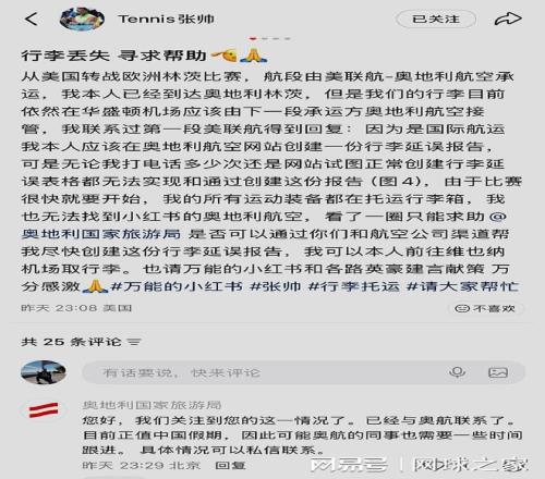 另外,張帥在飛抵奧地利林茨之后突然發(fā)現(xiàn),自己的行李不見蹤影。經(jīng)查詢發(fā)現(xiàn),行李居然還在華盛頓,沒有隨機(jī)到達(dá)。比賽即將開打,張帥在多方聯(lián)系未果的情況下,無奈通過小紅書向奧地利國(guó)家旅游局求助。截至目前,奧地利國(guó)家旅游局已經(jīng)回復(fù)收到,并正在處理中。