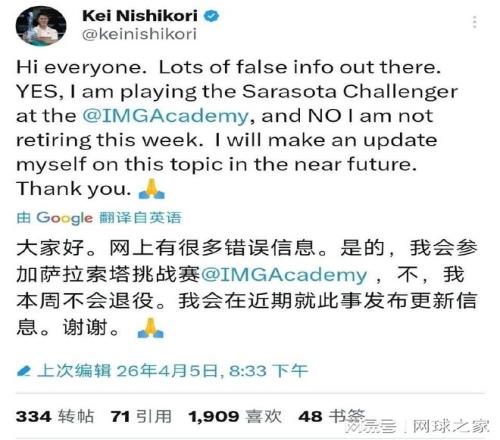 這則澄清帖發(fā)出后不到24小時,《隊報》隨后修正報道稱:“錦織圭不會在未來幾天內(nèi)放下球拍,他的經(jīng)紀人已向親近的記者否認了退役。”