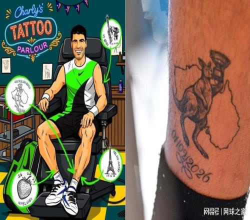 阿爾卡拉斯集齊全滿貫的紋身,右側(cè)是為慶祝奪得今年澳網(wǎng)冠軍而新紋的袋鼠和澳大利亞地圖/圖源:ATP官方微博